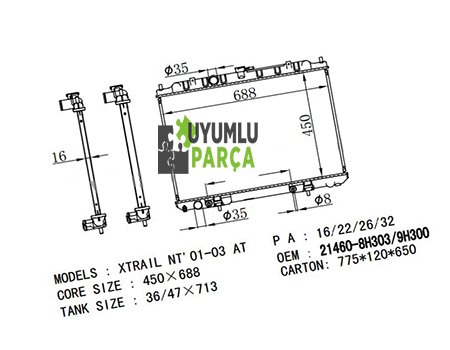 DEĞERLİ MÜŞTERİMİZ, NİSSAN XTRAİL SU RADYATÖRÜ 2001 -- 2005 MODELLER ARASINDAKİ ARAÇLAR İÇİN UYGUNDUR SİTEMİZDEKİ ÜRÜN ARACINIZA % 100 UYUMLU OLUP, YETKİLİ SERVİSTE SATILMAKTA OLAN ORJİNAL ÜRÜNÜN MUADİLİDİR